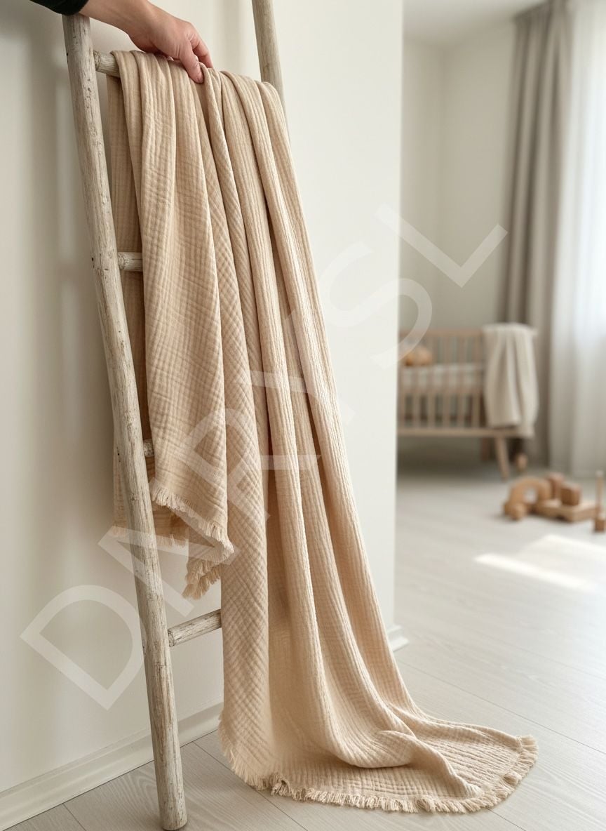 müslin bebek pikesi, 4 katlı müslin battaniye, pamuklu bebek örtüsü, bebek pikesi 100x130, püsküllü bebek battaniyesi, yenidoğan hediyesi, nefes alan bebek pikesi, yumuşak müslin örtü, bebek odası tekstili, bohem bebek pikesi