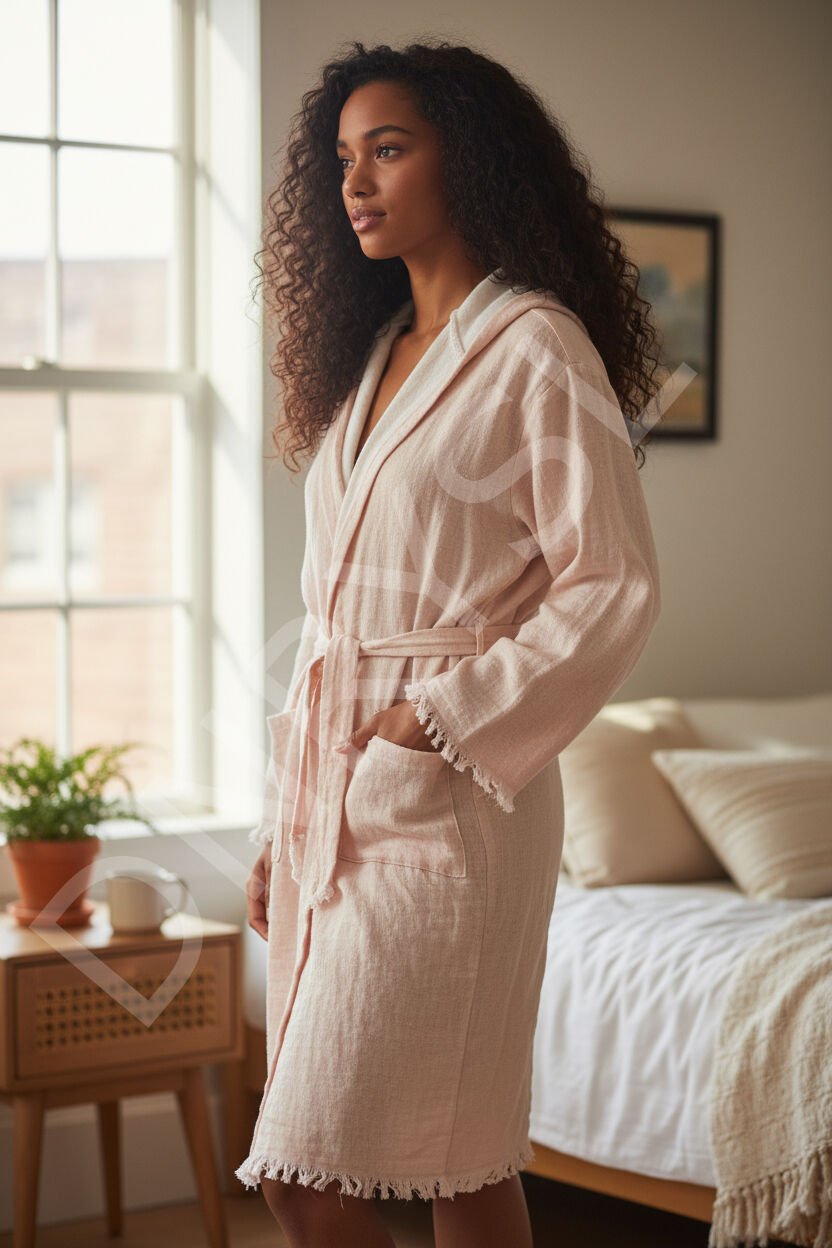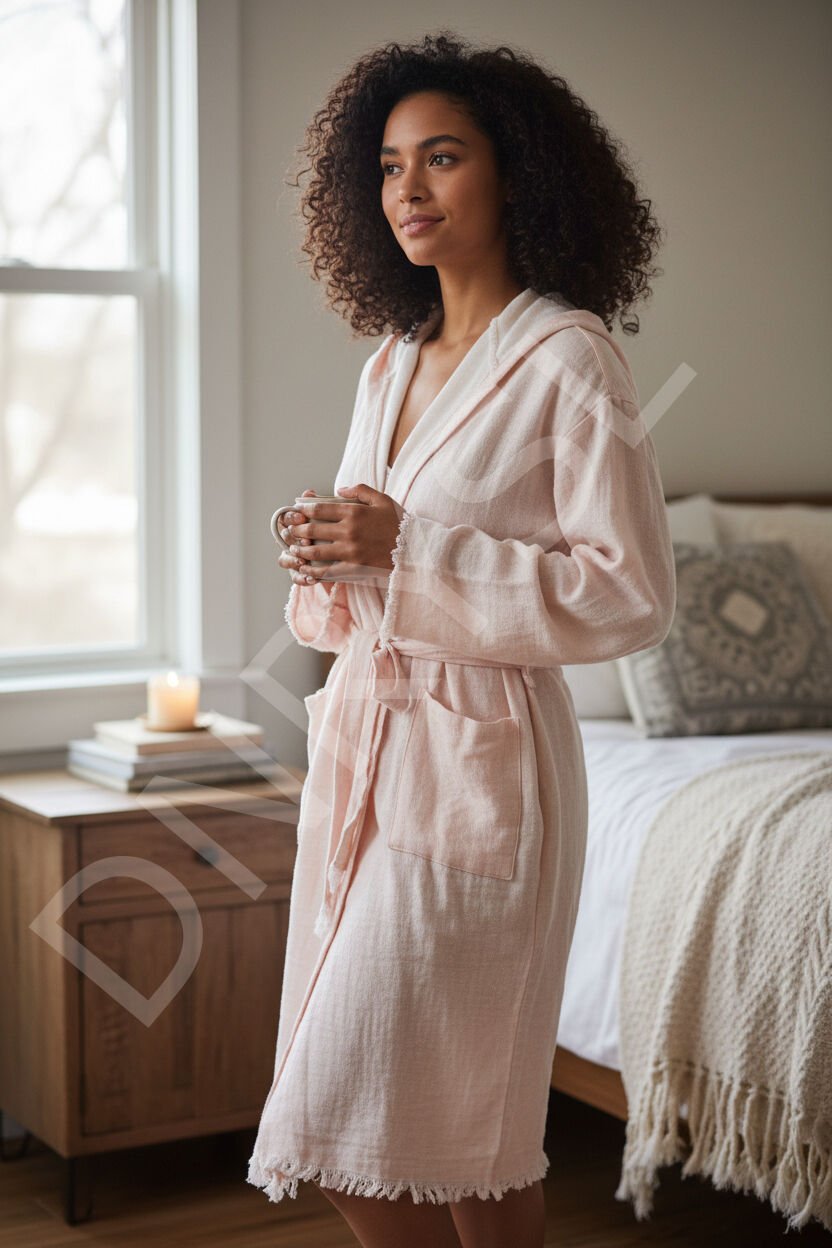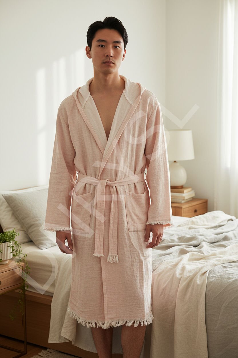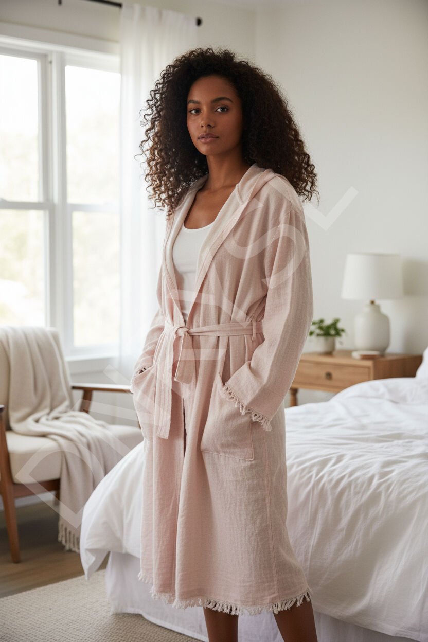Bohem Kapüşonlu 4 Kat Müslin Organik Unisex Bornoz, Pudra Pembe