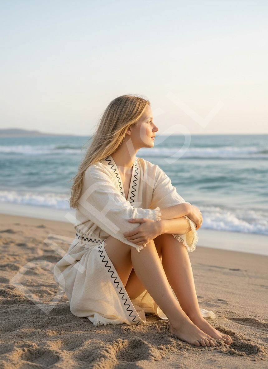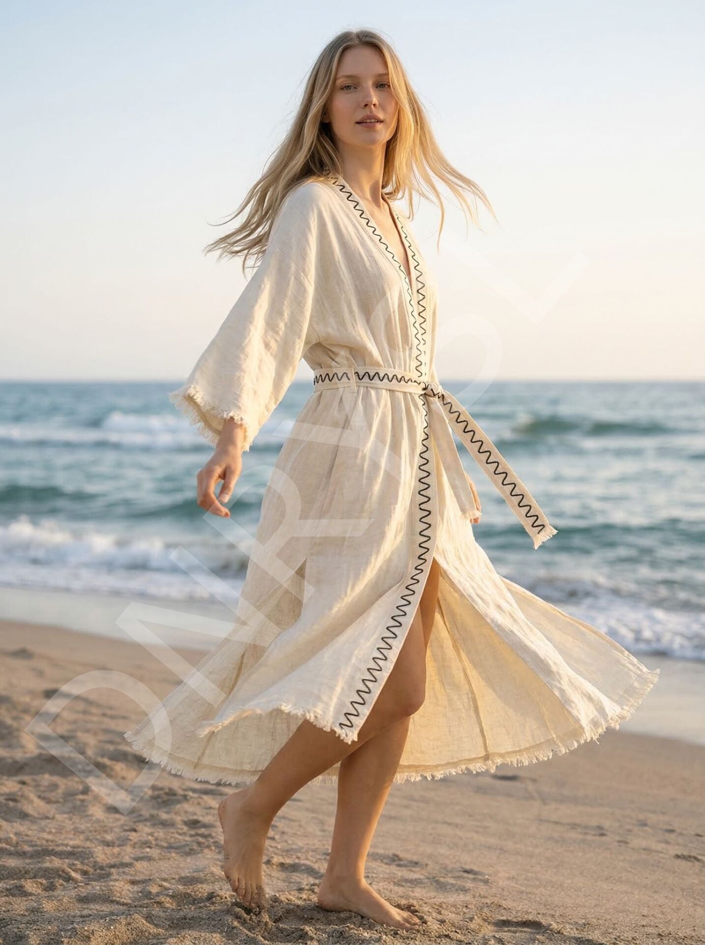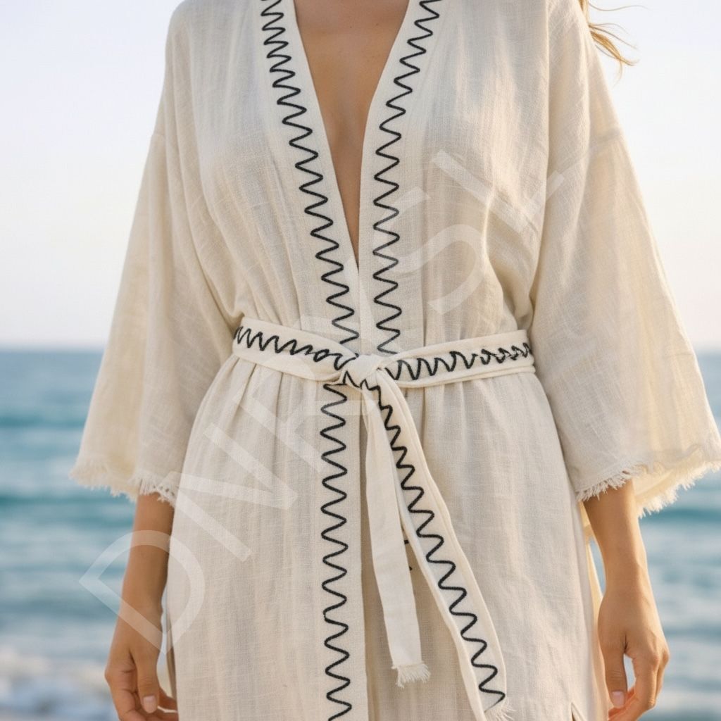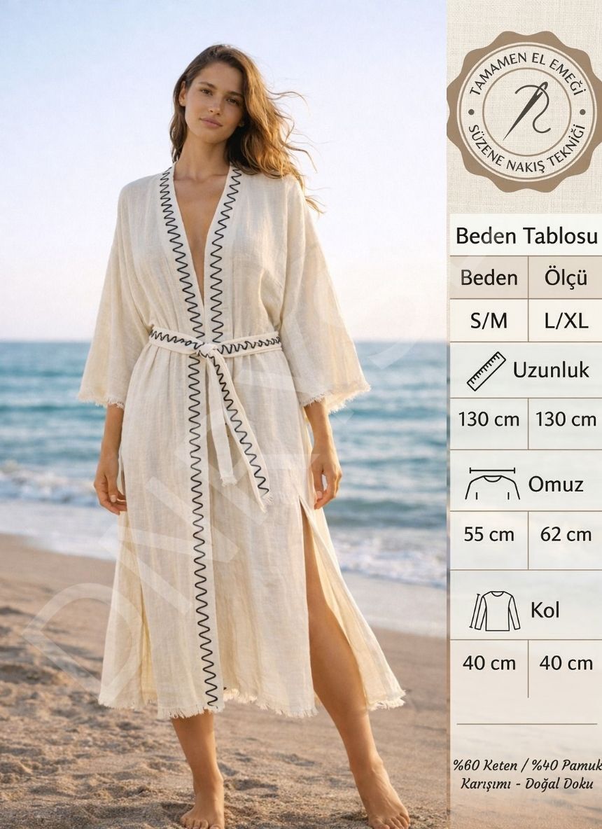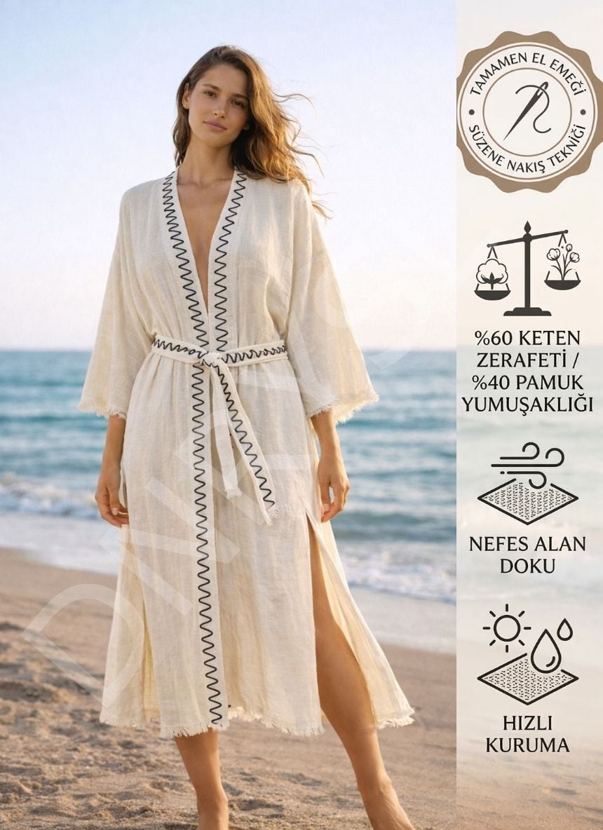 El Emeği Süzene Nakışlı Plaj Kaftanı, %60 Keten %40 Pamuk, Nefes Alan ve Hızlı Kuruyan Kumaş