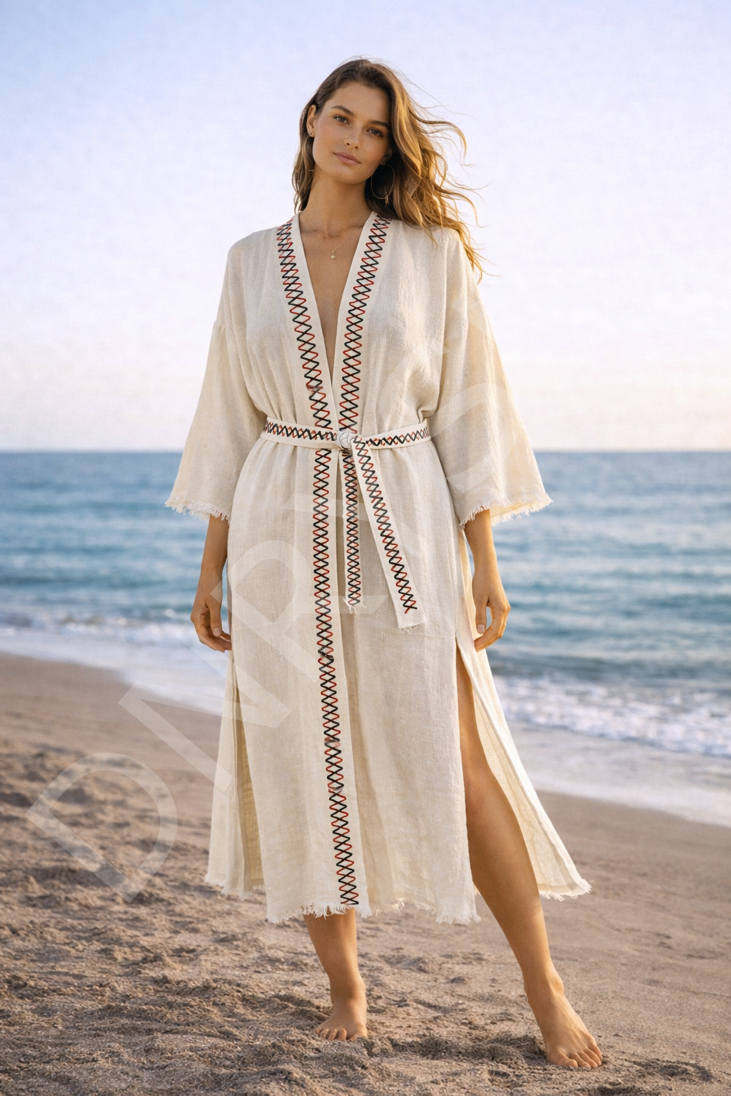 El Emeği Süzene Nakışlı Plaj Kaftanı, %60 Keten %40 Pamuk, Nefes Alan ve Hızlı Kuruyan Kumaş