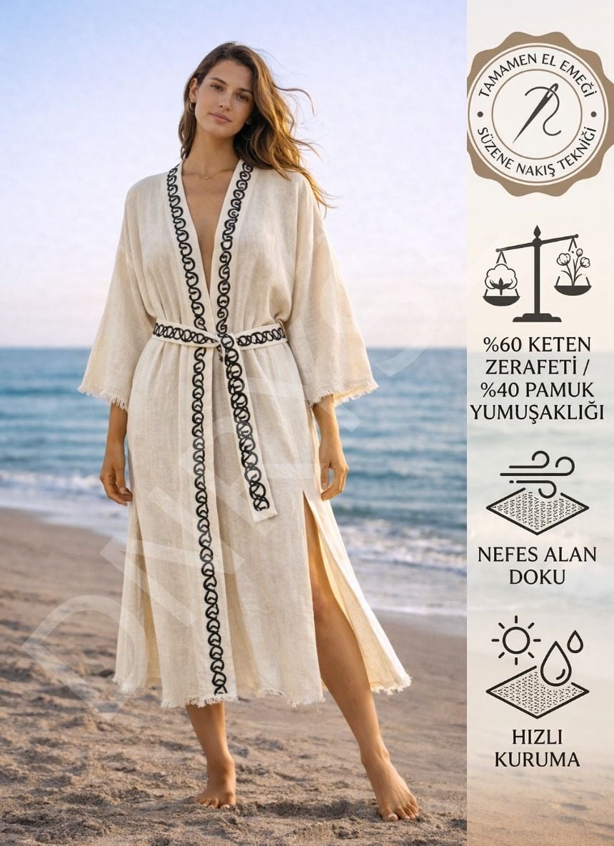 El Emeği Süzene Nakışlı Plaj Kaftanı, %60 Keten %40 Pamuk, Nefes Alan ve Hızlı Kuruyan Kumaş