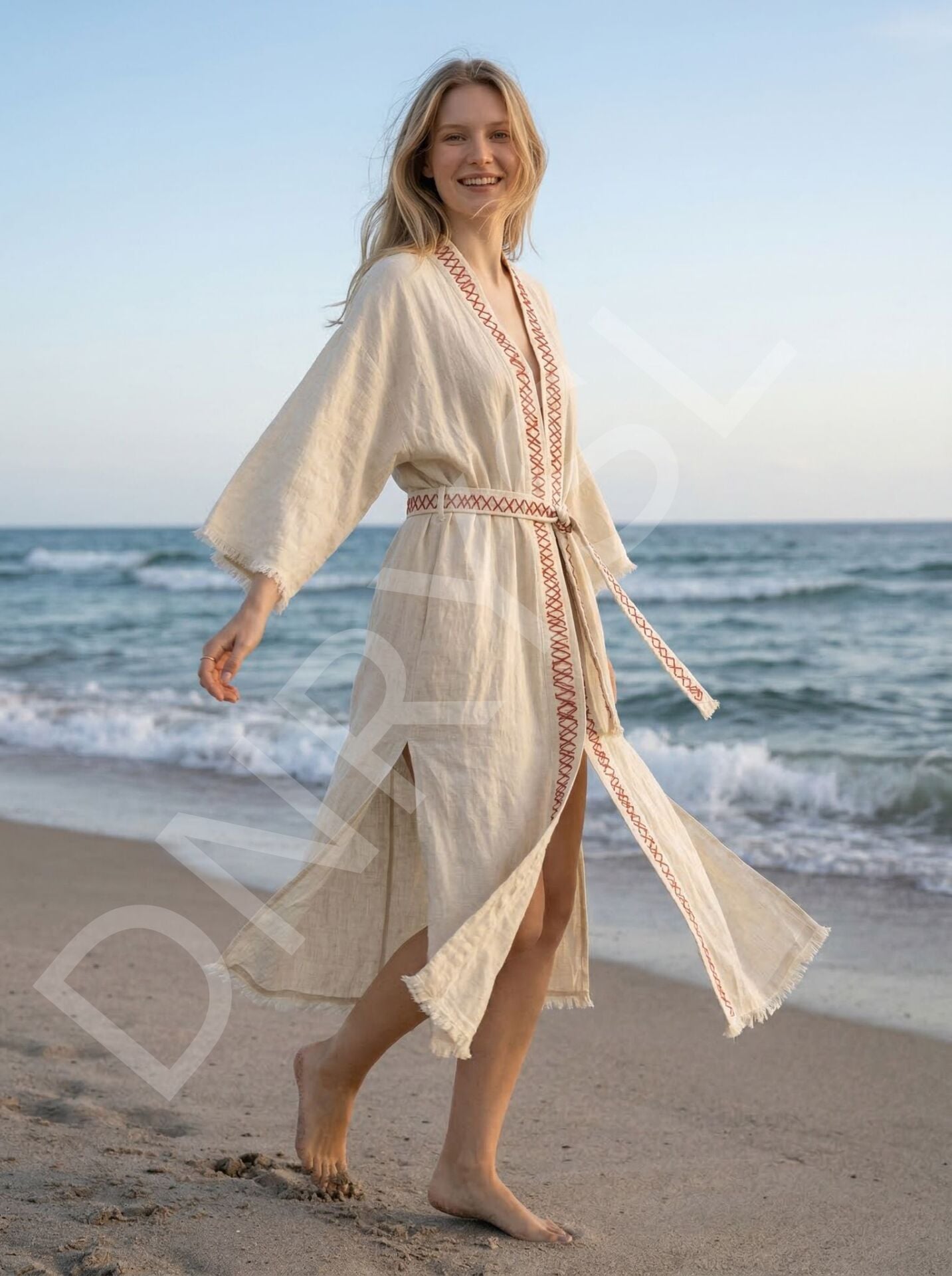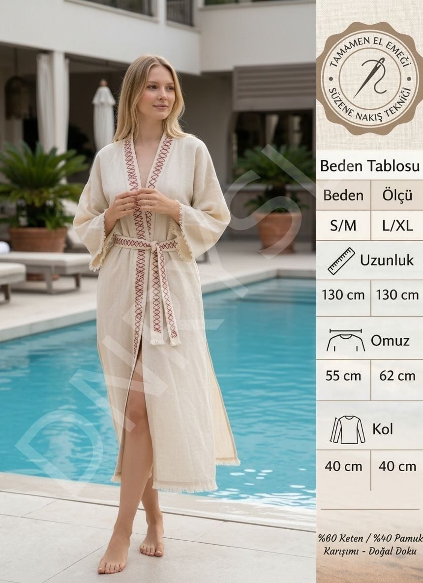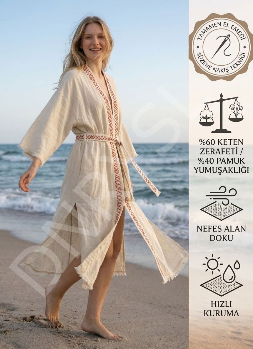 El Emeği Süzene Nakışlı Plaj Kaftanı, %60 Keten %40 Pamuk, Nefes Alan ve Hızlı Kuruyan Kumaş