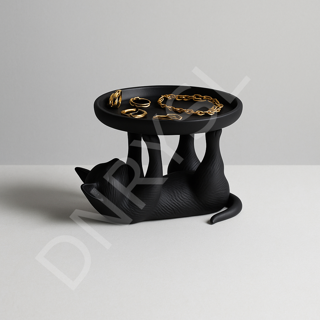 Kedi Formlu Dekoratif Takı Standı ve Makyaj Düzenleyici, PLA Malzeme, Minimal Organizer, Siyah