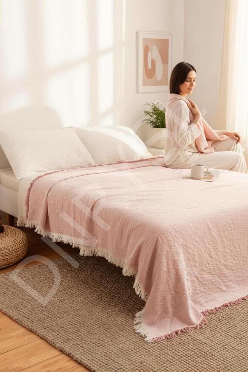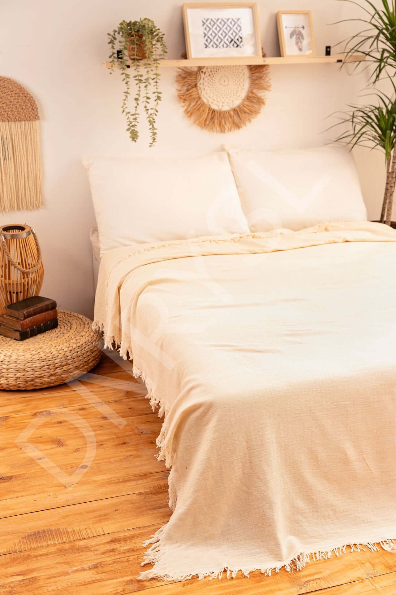 Doğal pamuk dokusuna sahip, nefes alan ve hafif müslin pike; dört mevsim kullanım için idealdir. Saçaklı bohem tasarımı ile yatak odanıza sıcak ve zarif bir hava katar.